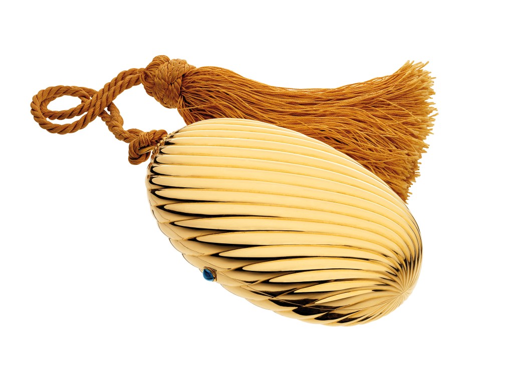 “Melone” evening bag in gold with sapphire, 1972. The polished and fluted oval case with cabochon sapphire thumbpiece, opening to reveal a fitted mirror, suspended on a golden colour silk cord terminating with a tassel. The interior is fitted with an oval mirror. With a golden coloured silk cord and tassel. Marks: on the rim (interior): “BVLGARI” stamped; lozenge with “750”.