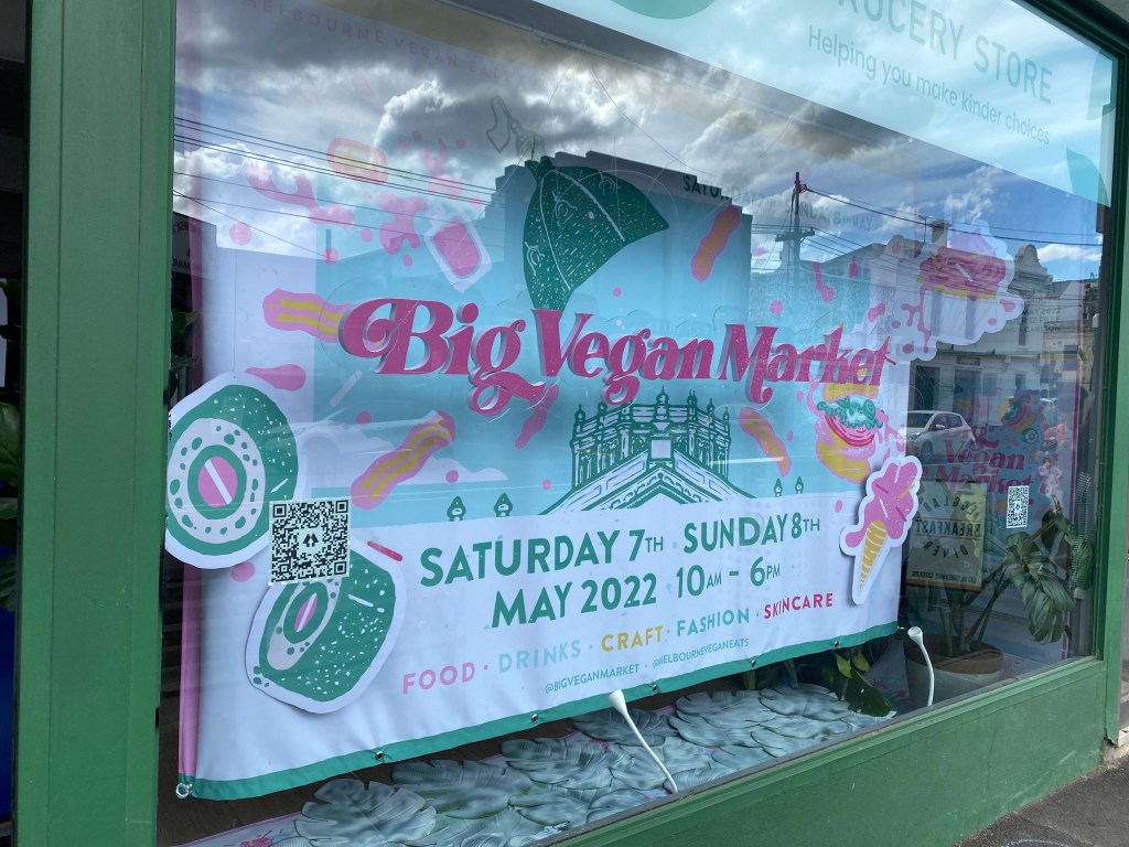 So, a revisit to my creative execution of a Fitzroy shop window and event decor was necessary. What resulted was a collaboration between client, artist and creative specialist to deliver effective visuals to attract visitors back to the market (Royal Exhibition Building is literally around the corner from Vegan Grocery store on Johnston St, so it was a no brainer).